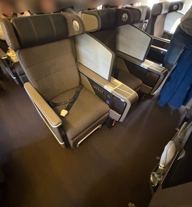 機内に一歩足を踏み入れると、そこには普通席とは一線を画す「プレミアムな空間」が広がっています。 プレミアムクラスのシートは、お隣との間隔が非常に広く、リクライニングも電動でスムーズ。